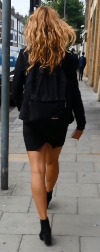 Street candid rear views of British college girls wearing extremely tight short pencil skirts as part of formal business-style uniforms: